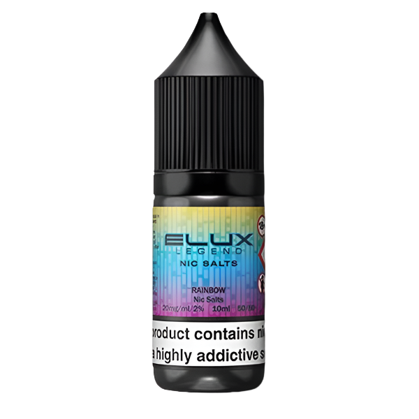 Elux Legend's Rainbow nic salt perfectly captures the flavors of sugary mixed fruit candy. The combination of fruity sweetness and sharp, fizzy undertones can be tasted from the first inhale to the final exhale.