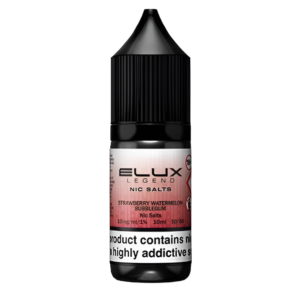 Elux Salts presents their Strawberry Watermelon Bubblegum nic salt e-liquid, a flavorful blend of juicy watermelon and strawberry notes infused with a sugary bubblegum taste for a uniquely sweet and complex experience.