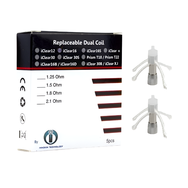iClear 16 Coils compatible with iClear 16 Dual Coil Clearomizer, 5-pack of replaceable coils with varying resistances for different vaping experiences.
